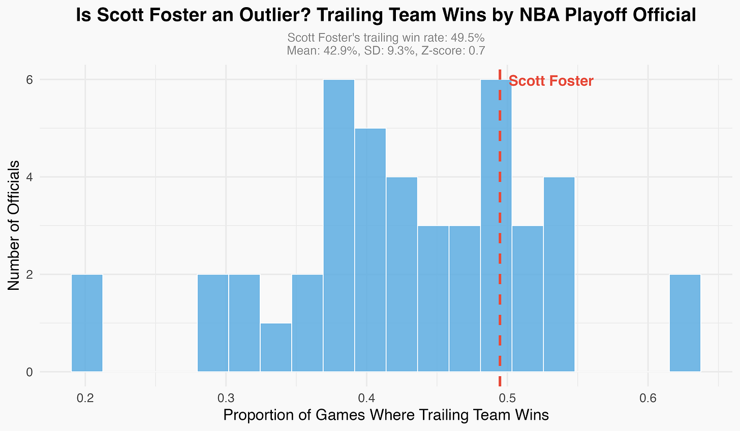 Scott Foster’s trailing team win rate from 2015 to present is 49%. Mean win rate across all officials in the same time period is 43%. The resulting empirical p-value is 0.31. This means 31% of officials have a trailing team win rate as high or higher than Scott Foster’s. At a conventional significance threshold (α = 0.05), we fail to reject the null hypothesis and conclude that there is no difference in the probability that a trailing team wins a playoff game officiated by Scott Foster versus games officiated by other NBA officials. There is no evidence that playoff series are extended (via trailing team wins) more frequently in games officiated by Scott Foster than by other NBA officials. In fact, Scott Foster’s rate is typical and not statistically unusual.