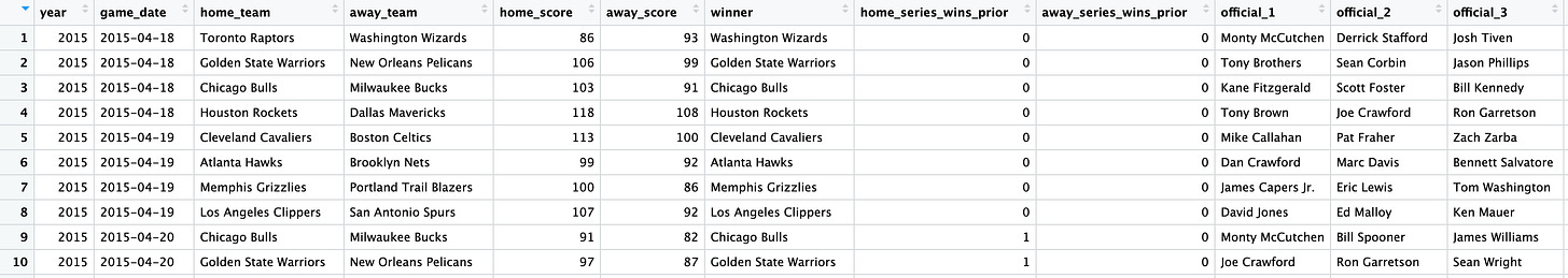 To do this analysis, I wrote some R code that leverages basketball-reference.com’s historical playoff box score data from 2015 to the present day. This allowed me to compile all 906 NBA playoff games in that time frame into a single dataset, with the necessary data elements required to do this analysis. Here is a screenshot of the raw output that was extracted from Basketball Reference for the first 10 playoff games of 2015: