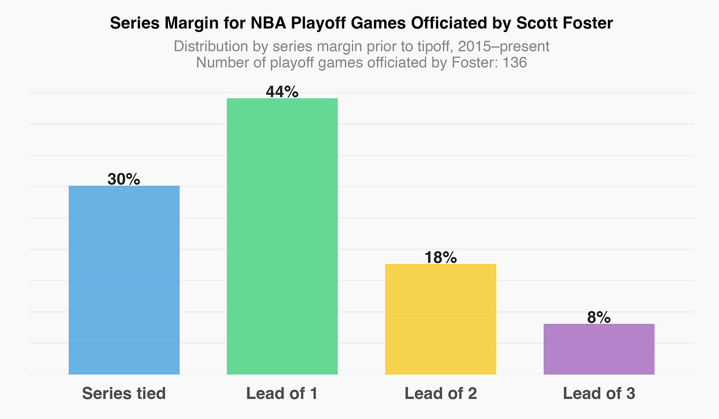 Of the 136 playoff games Foster has officiated since 2015, 95 games were instances where the series was not tied. Of those 95 games, the team trailing in the series won 49% of the time.